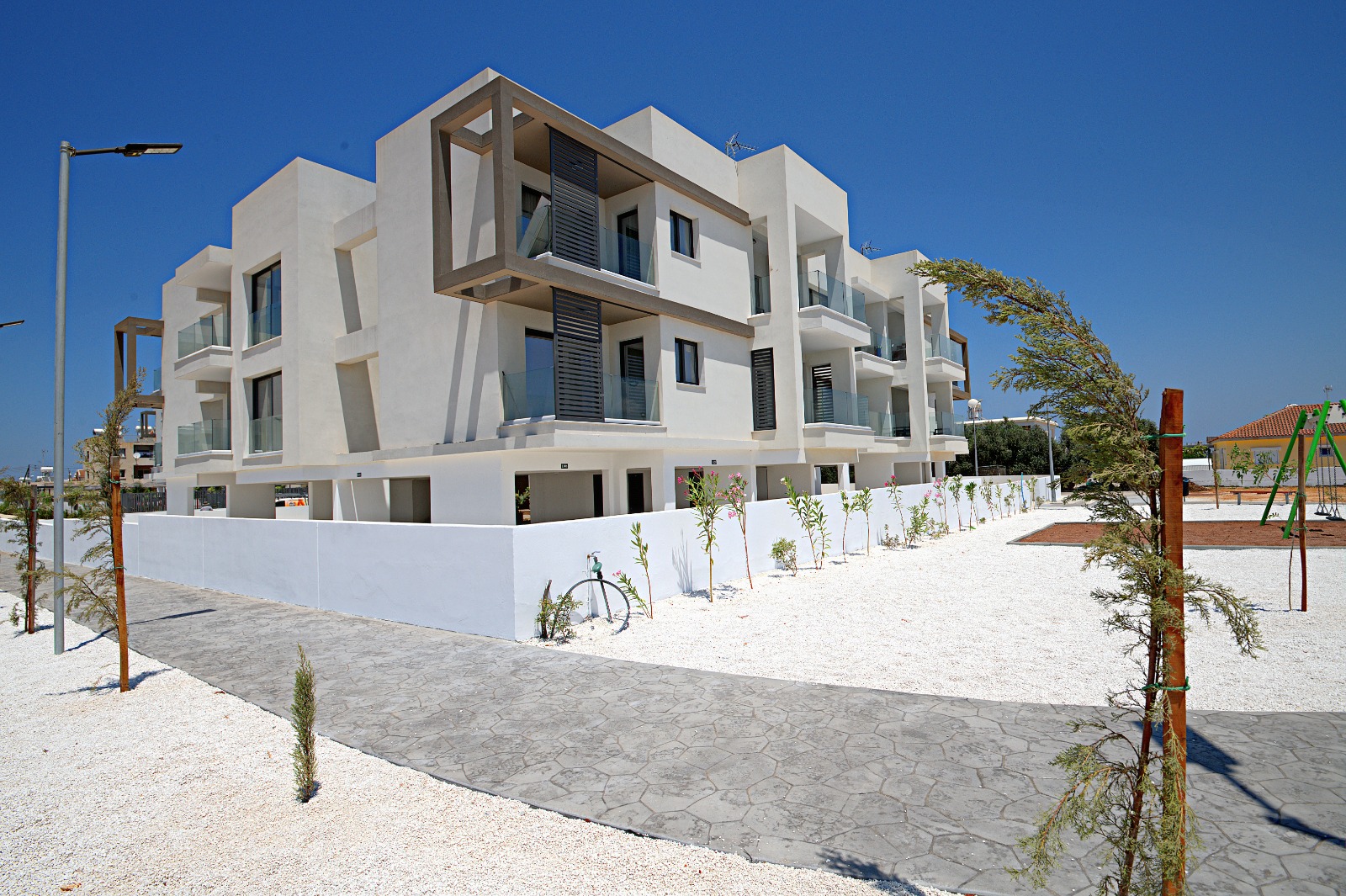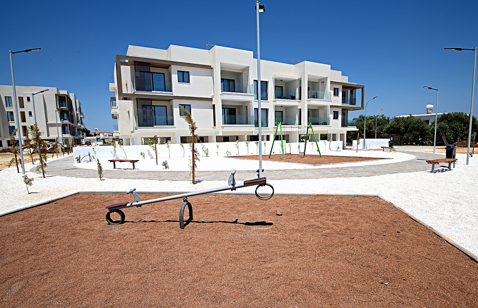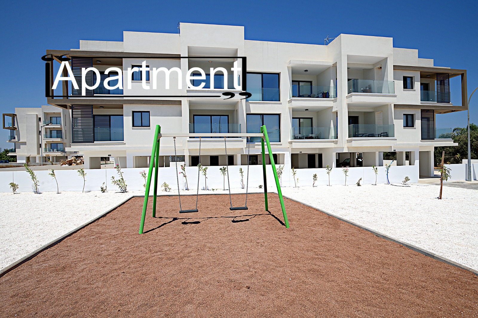 The apartment features air-conditioning, a kitchenette, washing machine, and a dishwasher. Additional amenities include a lift, outdoor seating area, children’s playground, and car hire.